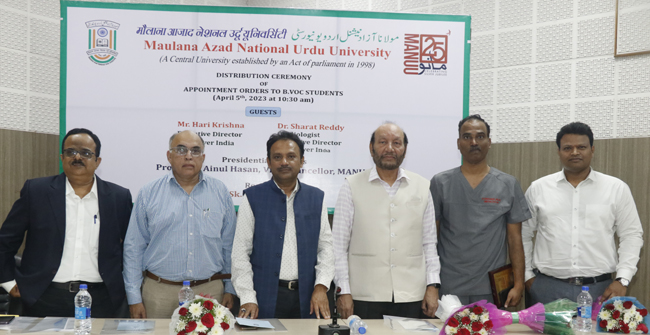 حیدرآباد (پریس نوٹ) یونیورسٹی میں بہت جلد ماسٹر آف ووکیشنل کورسز کا آغاز ہوگا ۔ اس کے علاوہ مارکٹ کی ضروریات کے پیش نظر مزید کورسز شروع کیے جائیں گے۔ یونیورسٹی کے ہیلتھ سنٹر میں فزیوتھیراپسٹ، اسکن اسپیشلسٹ اور کارڈیولوجسٹ کی خدمات بھی دستیاب ہوں گی۔ مولانا آزاد نیشنل اردو یونیورسٹی میں پروفیسرسید عین الحسن، وائس چانسلر نے آج بیچلر آف ووکیشنل کورسز کے آخری سمسٹر کے 16 طلبہ کو میڈی کور ہاسپٹل کی جانب سے تقرر ناموں کی تقسیم کے پروگرام میں ان خیالات کا اظہار کیا ۔ ان طلبہ کا میڈی کور کے ریڈیالوجی اور میڈیکل لیب شعبوں میں تقرر عمل میں آیا ہے۔ بیچلر آف ووکیشنل کورسز کے اولین بیچ کے 50 طلبہ کے منجملہ 16طلبہ کا انتخاب فائنل امتحان سے قبل عمل میں آیا ہے۔ ان طلبہ نے میڈی کور ہاسپٹل میں 6 ماہ کی انٹرن شپ 2؍ اپریل کو مکمل کی ۔ بی ووک طلبہ کے لیے17؍ اپریل کو یونیورسٹی کے ٹریننگ اینڈ پلیسمنٹ سیل کی جانب سے ایک پلیسمنٹ ڈرائیو کا انعقاد بھی عمل میں آرہا ہے جس میں مختلف ہاسپٹلس حصہ لیں گے۔مانو پہلی یونیورسٹی ہے جہاں بی ووک پروگرام کا آغاز کیا گیا ہے۔