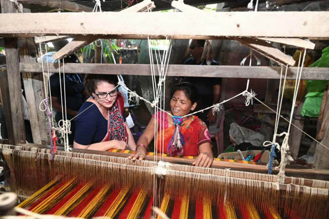 VALMIKI NAGAR, NOV 5 (UNI):- Congress MP Priyanka Gandhi Vadra interacts with a woman engaged in weaving work, during her visit to Valmiki Nagar, Bihar. on Wednesday. UNI PHOTO-152U